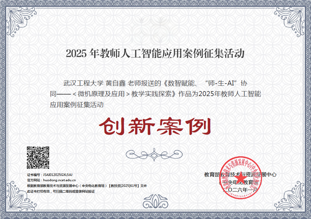 本网讯(通讯员 李子骞 常涛)近日,教育部教育技术与资源发展中心(中央电化教育馆)公布了2025年教师人工智能应用案例征集结果。公司黄自鑫教授主持申报的《数智赋能、“师-生-AI”协同——<微机原理及应用>教学实践探索》获评创新案例。