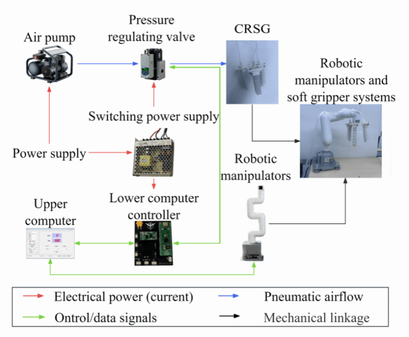论文面向化学实验室中强酸碱等腐蚀性介质广泛存在、传统刚性机械手易腐蚀且易损伤脆弱器皿的问题,提出了一种材料、结构、控制协同设计的抗腐蚀柔性抓取器(Corrosion-Resistant Soft Gripper,CRSG)。抓取器基于掺杂纳米 SiO₂ 的医用加成型硅橡胶及编织网状限应变层构成三指柔性夹爪,并结合空气泵、比例减压阀与闭环腔压控制,实现对多种实验器皿的顺应、安全抓取。实验结果证明该抓取器兼具优良耐腐蚀性与安全抓取能力,可有效降低实验人员暴露风险,对推动化学实验室自动化具有重要意义。