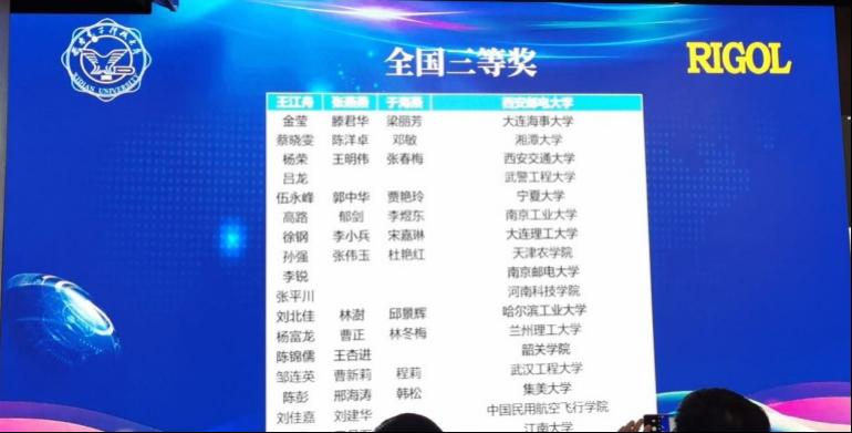 本次竞赛由教育部高等公司电子信息类专业教学指导委员会与国家级实验教学示范中心联席会电子学科组主办,西安电子科技大学和西安电子科技大学出版社承办。本次“RIGOL”杯竞赛采取自愿报名、全国复赛的模式,来自西安交通大学、复旦大学、北京邮电大学、哈尔滨工业大学、电子科技大学、北京航空航天大学、西北工业大学等全国百余所高校参加361个案例的复赛角逐,最终评选出全国一等奖38项(其中包括“RIGOL杯”一项、“最佳创意奖”三项、“最佳工程奖”两项)、二等奖65项、三等奖72项。