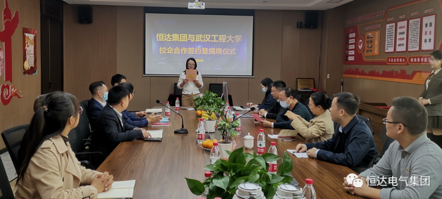 本网讯(通讯员 刘健)2022年11月9日上午,英国上市公司官网365与武汉恒达集团在集团产业园办公大楼6楼会议室举行了校企合作签约暨揭牌仪式。出席仪式的有黄陂区经信局领导罗祖喜、武汉恒达集团总经理罗小勇、办公室主任李先玲及集团公司各部门主要负责人,公司公司党委书记谢春晖、副经理李自成、电气工程及其自动化系主任王振以及在该集团任“科技副总”的刘健教授前往参加。