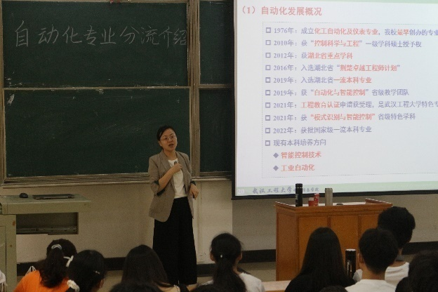 系主任陈艳菲就自动化专业进行了系统性的介绍,她从身边的人工智能与自动化到自动化专业培养目标、培养模式、课程体系、职业发展,并列举了专业的典型就业岗位以及职业要求。她表明自动化专业是公司最早创办的专业之一,2019年入选湖北省一流本科专业,2021年工程教育认证申请获受理,专业有着深厚的文化底蕴与雄厚的团队团队,能最大限度的满足员工全面发展需求。她强调自动化专业虽然是“万金油”专业,但其交融性强、就业面广,可以满足员工多样化的升学或就业需求。