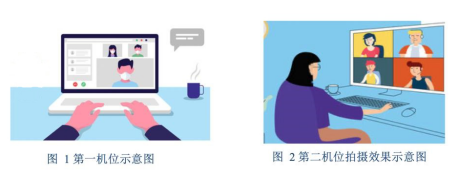 考生双手摆放桌面,第一机位正向面对考生,复试过程中全程开启,视频中考生界面底端始终不得高于胸部,双手须全程在视频录像范围。第二机位从考生侧后方45°距离本人1m处拍摄,可以拍摄到考生侧面及第一机位屏幕,需保证考官能够从第二机位清晰看到第一机位屏幕。
