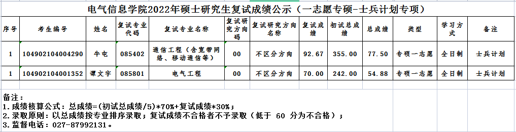 2022年硕士研究生复试成绩公示(一志愿专硕-士兵计划专项)