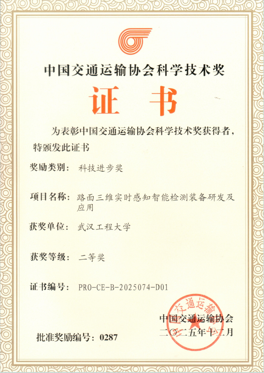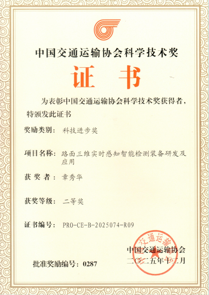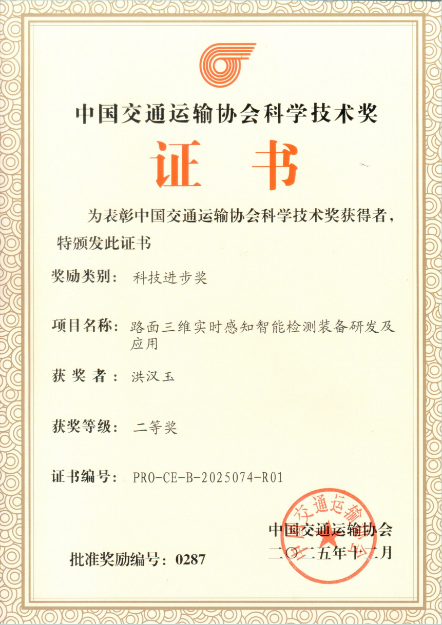 本网讯(通讯员 朱丽娜 叶亮)近日,2025年度中国交通运输协会科学技术奖表彰大会暨现代综合交通运输学术论坛在北京举办。大会以“科技赋能交通强国建设”为主题,汇聚院士专家、科研工作者、高校学者、企业代表等各界人士,共商交通科技创新与高质量发展大计。公司洪汉玉教授牵头完成的成果“路面三维实时感知智能检测装备研发及应用”获中国交通运输协会科技进步二等奖,标志着洪汉玉教授团队的研究成果获得了全国交通运输行业的权威认可。