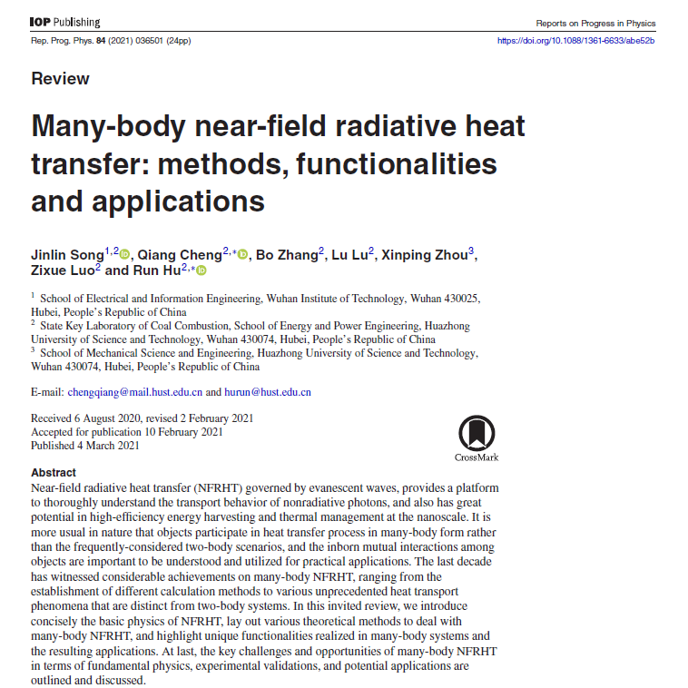 本网讯(通讯员 李自成202134日,物理类顶级期刊Reports on Progress in Physics(影响因子17.032Top期刊)在线刊发了公司英国上市公司官网365青年教师宋金霖与华中科技大学合作的题为"Many-body near-field radiative heat transfer:methods, functionalities and applications"的综述论文。