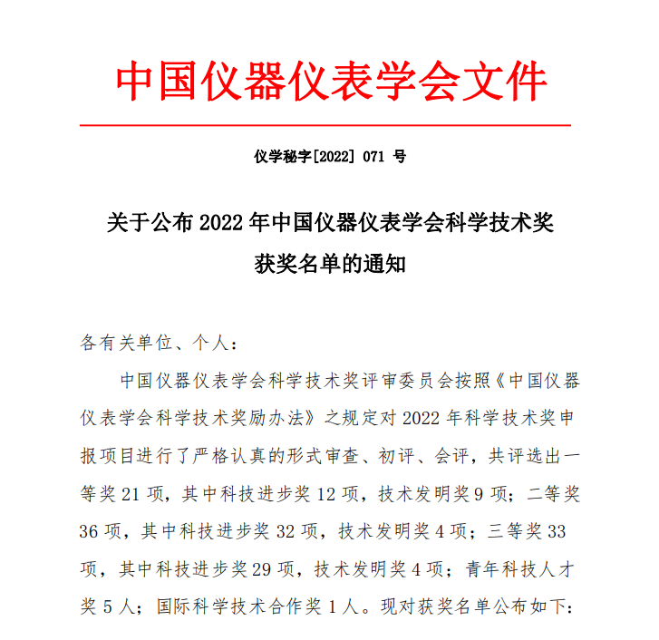 中国仪器仪表学会(China Instrument and Control Society)是中华人民共和国民政部授予的中国社会组织评估等级5A级科技社团,国家一级学会,具有国家奖推荐资格。今年中国仪器仪表学会评奖竞争相当激烈,中国仪器仪表学会从200多项候选项目中,经过严格认真的形式审查、初评、会评,共评选出一等奖21项(不设置特等奖),其中科技进步奖12项,技术发明奖9项;二等奖38项,其中科技进步奖33项,技术发明奖5项;三等奖33项,其中科技进步奖29项,技术发明奖4项。