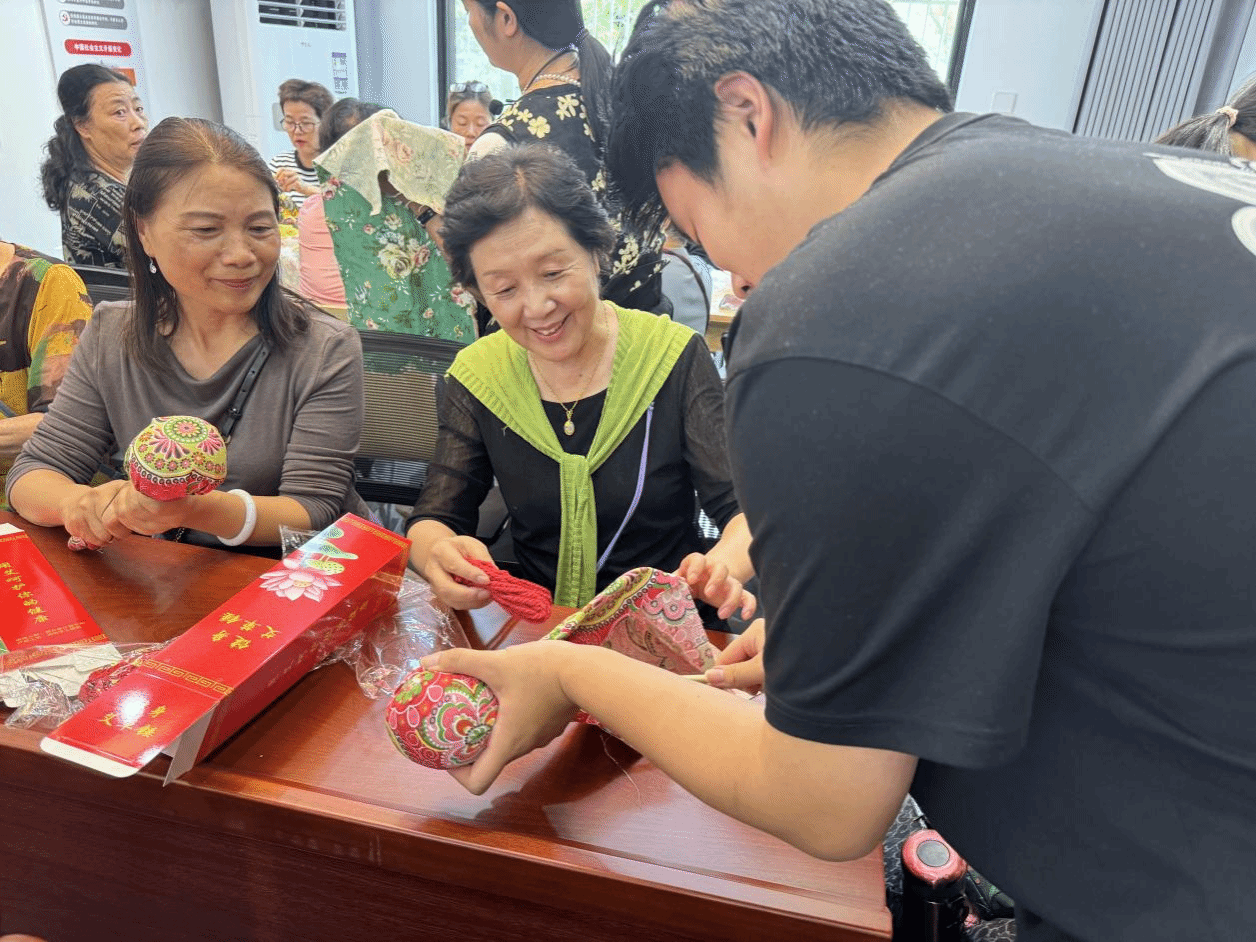 活动现场志愿者们细心分发粗布、艾草包、手柄等手工材料,社工张老师一边讲解艾草锤的功效和作用,一边为大家演示如何制作,“打开艾草包,铺平布料,先将晒干的艾草用内布料包裹住,捏成一个紧实的圆形,捆绑皮筋,随后把支撑棍插入包好的艾草包......”。志愿者们耐心地解释每一个步骤,一对一帮助不会操作的老年人,这不仅是一次技能传授,更是一次心与心的交流。