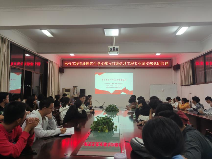 本网讯(通讯员 黄光亮 杨子仪) 10月25日晚,湖北省“研究生样板党支部”电气工程专业研究生党支部与2024级信息工程1班团支部党团共建活动在公司4B 319会议室举行。