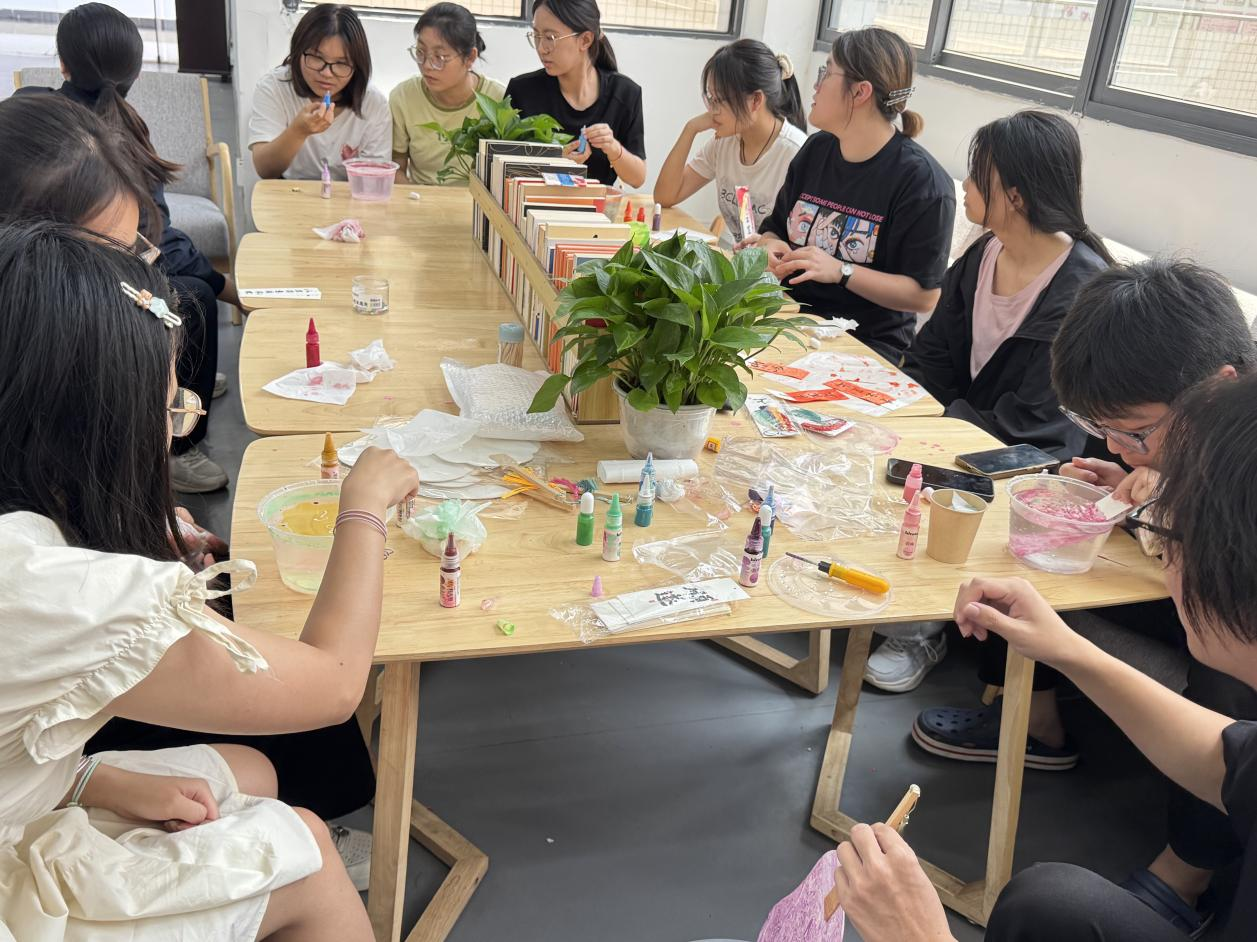 “知音汇”志愿团队为本次活动带来非遗“漆扇”制作。大家绘就情绪的调色盘,在“指尖疗愈”时刻,都投入到手工漆扇的制作中,调色、滴染、轻摇、拓印……每个人专注地沉浸于色彩与水的交汇,每个扇面都晕染出独一无二的色彩。胡黄静表示,这就像处理情绪,有时需要一点流动和释放,才能呈现出意想不到的美。绘制漆扇的过程,不仅是艺术创作,更是释放压力、静观内心的体验。