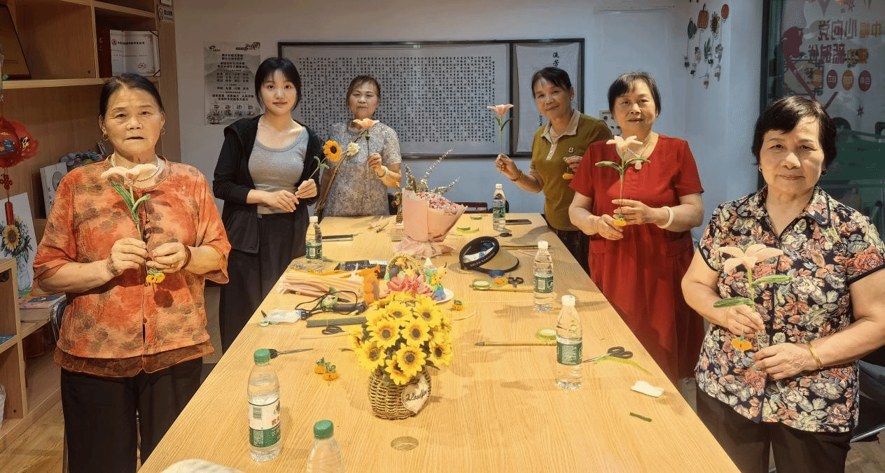 非遗手工课巧妙地将传统技艺与现代生活、代际互动结合起来。在“非遗绒花”课堂上,志愿者别出心裁地用色彩鲜艳、易于塑形的扭扭棒替代传统复杂材料。从第一节制作象征吉祥的“小柿子”挂件开始,到最后一节课完成“柿柿如意”花束、郁金香花束、凌霄花盆栽。社区居民在志愿者手把手的指导下,将一根根普通的扭扭棒变成了造型精美的艺术品。