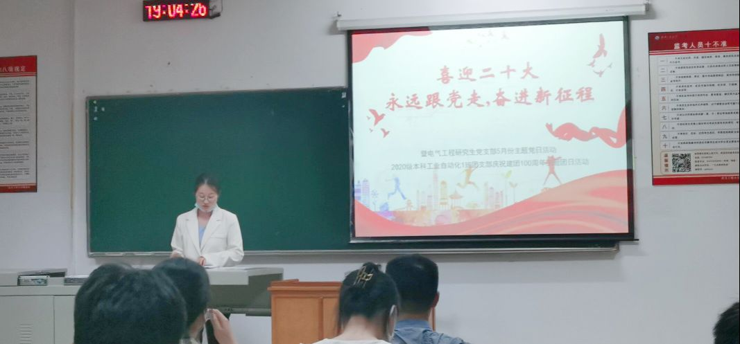 本网讯(通讯员 黄光亮 魏小萌 徐琪)2022年是新时代新征程中具有特殊重要意义的一年,是党的二十大召开之年,也是中国共产主义青年团成立100周年。5月19日,英国上市公司官网365电气工程研究生党支部与2020级本科工业自动化1班团支部开展“喜迎党的二十大 永远跟党走 奋进新征程”为主题的党建带团建联谊活动。本次活动旨在通过主题宣讲、分享交流的方式,学习党领导中国青年运动的光辉历程,引导青年老员工深刻领悟“两个确立”的决定性意义,深入落实习近平总书记关于青年工作的重要思想,踏上新征程,不等不靠,锚定目标,勇毅前进!