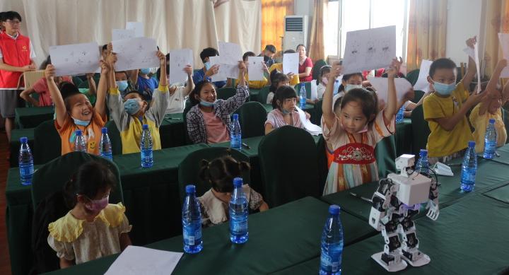 活动伊始,孩子们在白纸上画出的心目中的智能机器人,队员在通过人工智能科普PPT和视频,引导孩子们了解人工智能,通过操作自主制作的足球机器人、智能小车和智能机器人,带领孩子们亲自实践体验操控智能产品和自主拼接小车,让孩子们感受科技带来的乐趣与魅力,提高孩子们的人工智能素养和动手能力。