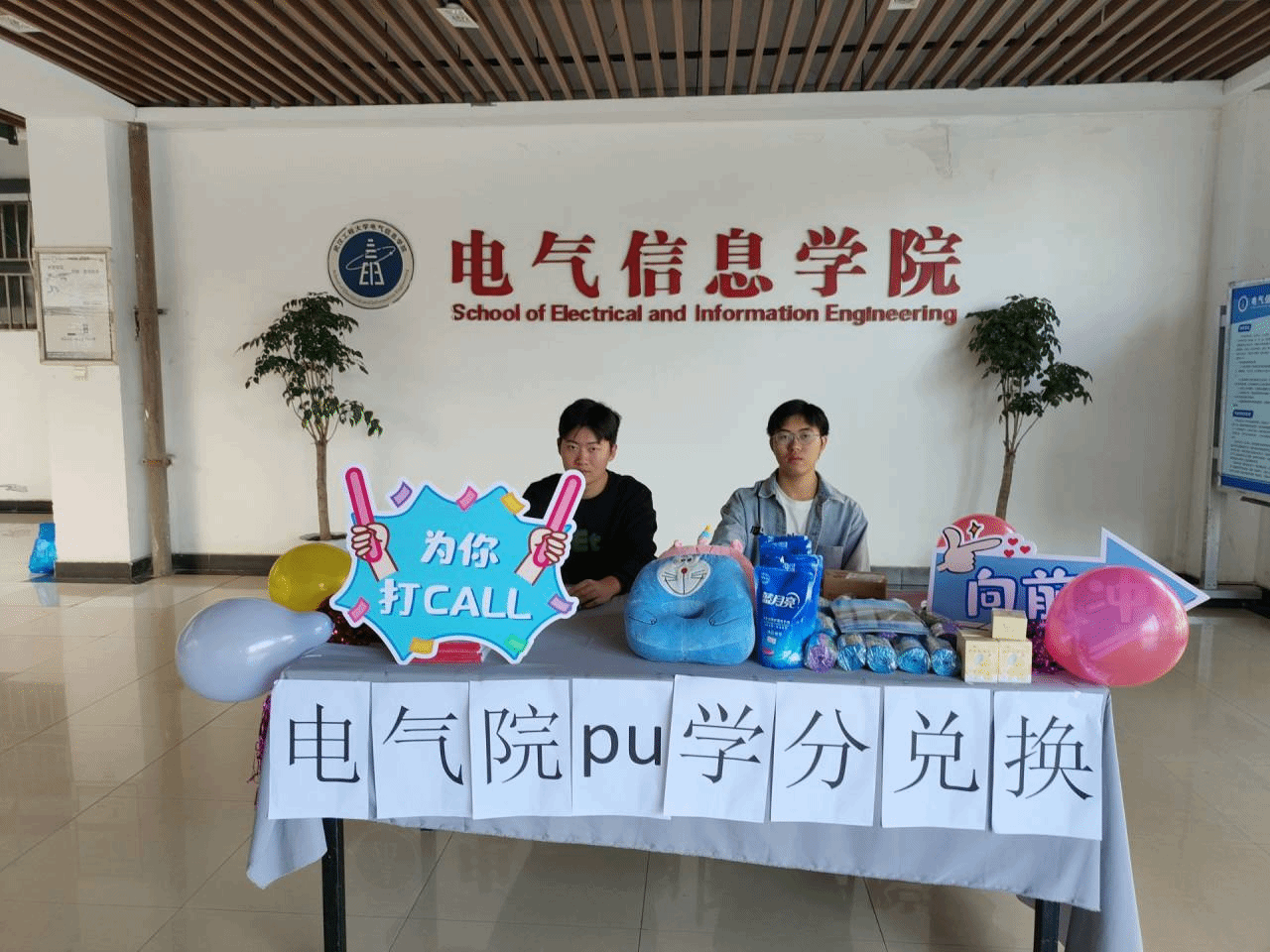 团委员工会员工志愿者精心组织,执行到位。本次兑换地点设在电气院大一楼大厅,公司准备了丰富的礼品供同学们兑换,包括颈枕,小夜灯,洗衣液等。同学们纷纷拿出自己的学分卡,期待能尽快兑换到心仪的礼品。