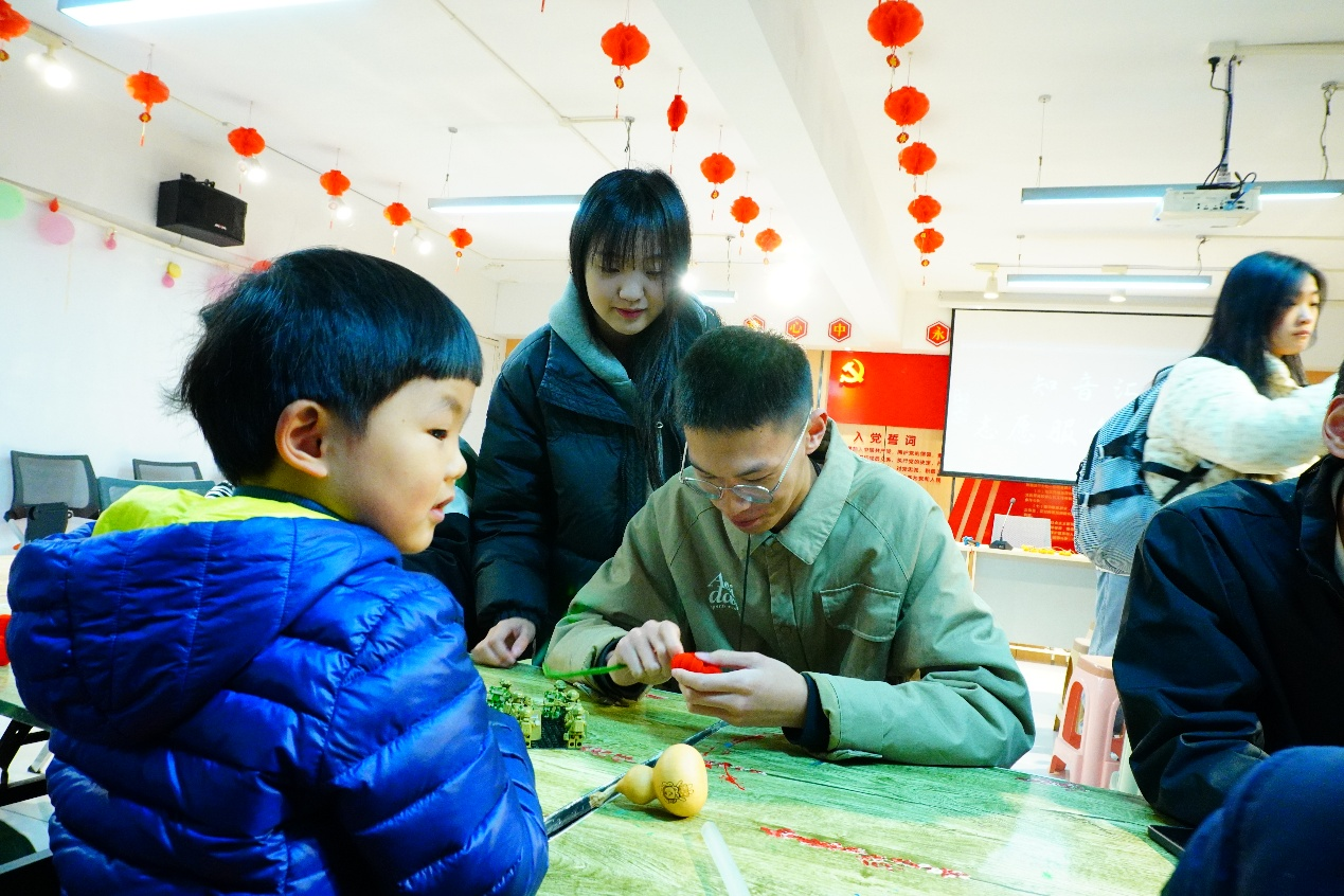 活动伊始,志愿者通过讲解和展示图片,向孩子们介绍了绒花的历史,呈现了非遗绒花的制作工艺。制作环节采取"1名志愿者+1名儿童"的陪伴模式。志愿者手把手教授缠绕技巧:"先绕一个小圈,像这样慢慢往外扩展..."为确保安全,剪刀等工具均由志愿者辅助使用,特别选用扭扭棒代替传统蚕丝材料,选用橙色寓意"事事如意"的主题小柿子。活动中设置了"非遗小讲堂"环节,6岁的朵朵小朋友将制作的小柿子送给母亲,并表达了"事事顺利"的祝福。