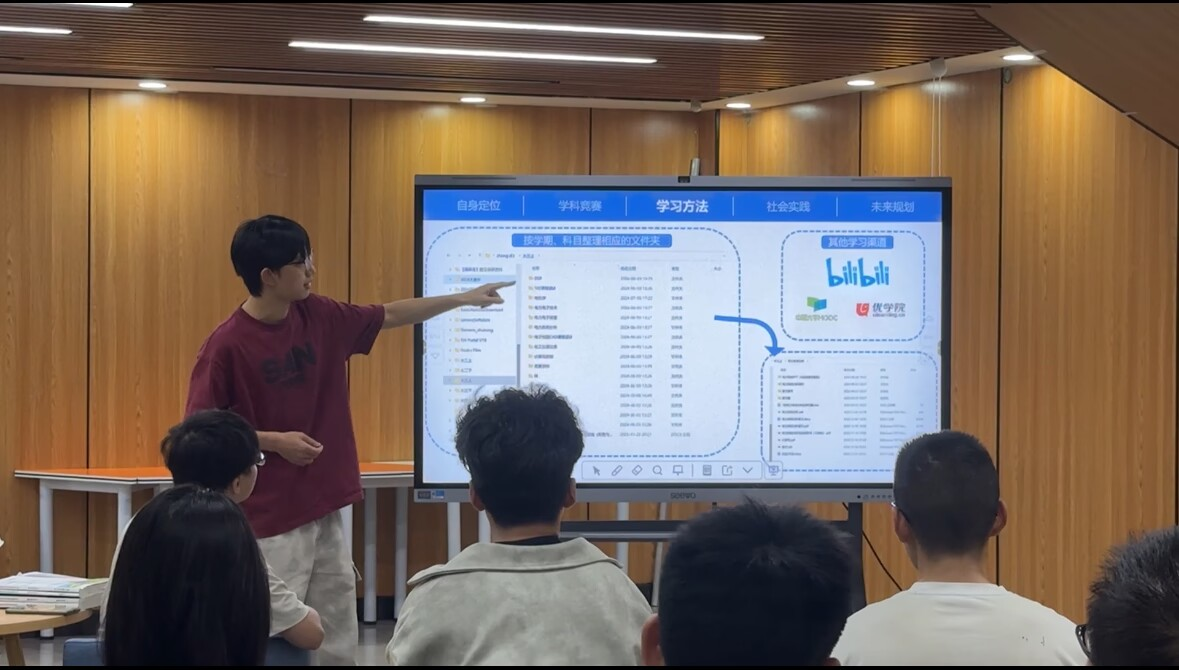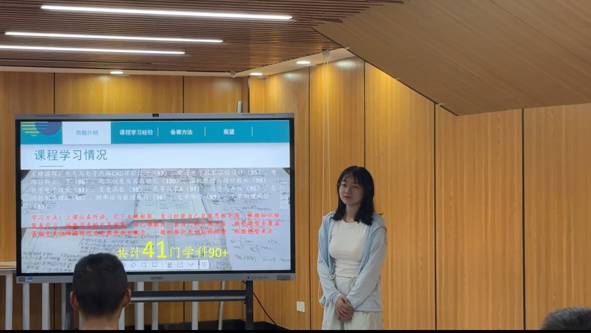 连续两年荣获“国家奖学金”的姜枫洁建议课程学习中对题型及相关解题方法做好分类,课中认真听讲,解题是提升自我的关键。她将学科竞赛划分为创新设计、技术研发、应用实践三大类型,建议善用“导师智库+学长经验+实验室资源”的黄金三角组合,以赛促学实现科研能力的阶梯式跃升。