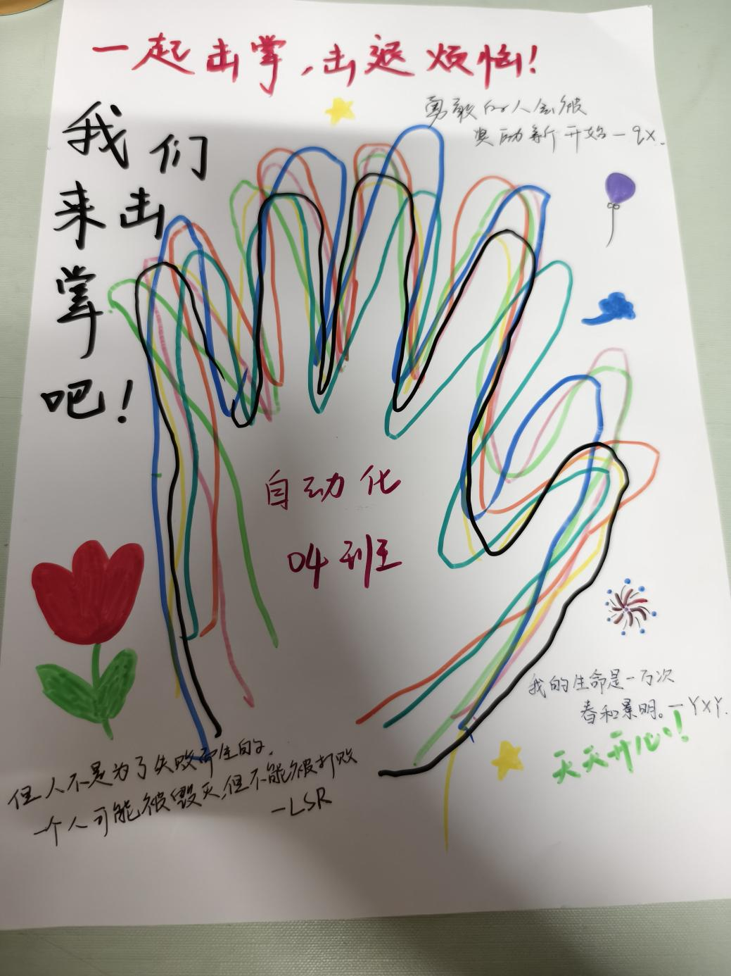 2024级自动化04班开展了“心有灵犀”的猜词活动。同学们分为两队,一队比划,一队猜词。大家充分发挥想象力和创造力,用各种生动的动作和表情来传递信息。同学们一起在一张纸上画下了自己的手印,这一个个手印代表着共同的决心和承诺,让班级成为一个更加团结、和谐、积极向上的集体。