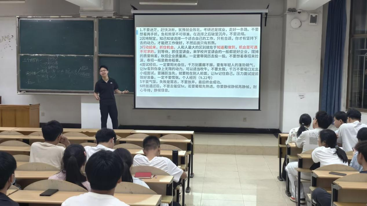 上岸孝感市选调生的代浩辰以三二一法则破解考公秘诀,即明确目标、边界与价值,夯实笔试面试基础,永葆为民初心。签约知名企业的刘舜禹、袁野、王科、姚安洋、赵文涛等5名员工代表从简历优化、实习蓄力、自信面试三阶段展开分享,指出扎实的专业基础、丰富的实践经历和充分的笔面试准备是斩获心仪工作的关键。