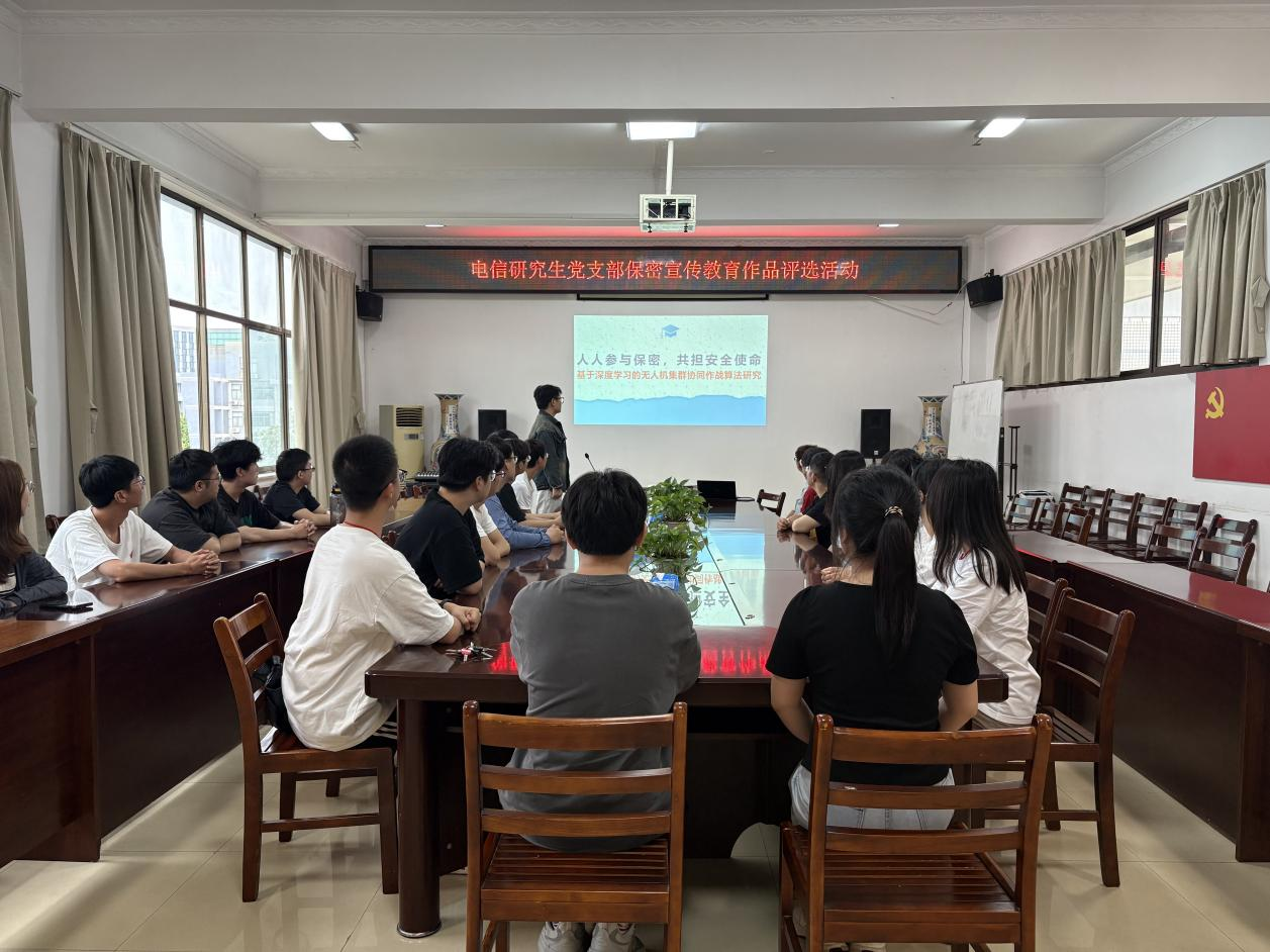 5月19日,支部举办保密宣传教育作品评选活动。前期,支部面向全体党员、预备党员和入党积极分子征集保密宣传教育作品,鼓励大家通过在研课题、纪实文学以及微视频等形式,创作贴近学习生活的保密宣传作品。其中《人人参与保密,共担安全使命——基于深度学习的无人机集群协同作战算法研究》获一等奖,《二进制代码的防线》等作品获二等奖,《你的沉默》等作品获三等奖。