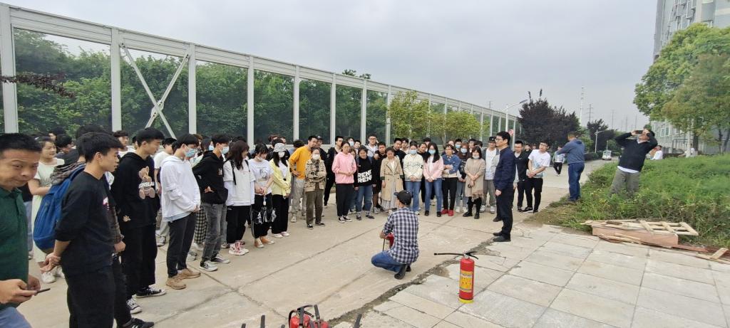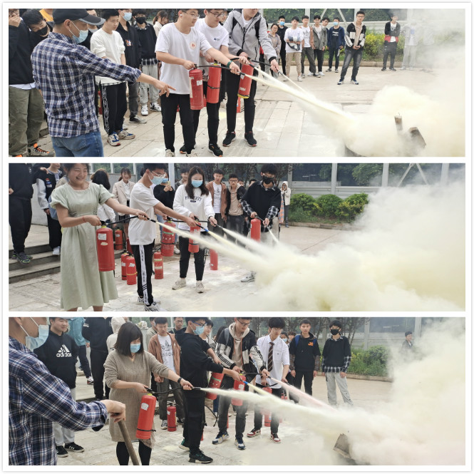 校保卫处欧阳诗虎老师为大家普及消防基础知识,告诫同学们不使用大功率电器、不乱接电线,不在宿舍存放易燃易爆物品,外出要确保电器断电、拔掉电源。校保卫处王子龙老师为同学们讲解发生火灾时的应对措施、疏散逃生的注意事项,介绍了灭火器的使用、保养方法,同时手把手教同学们如何使用灭火器,示范了灭火器的使用及扑救火灾的消防演练。同学们在保卫处老师的指导下依次使用灭火器,扑灭明火。