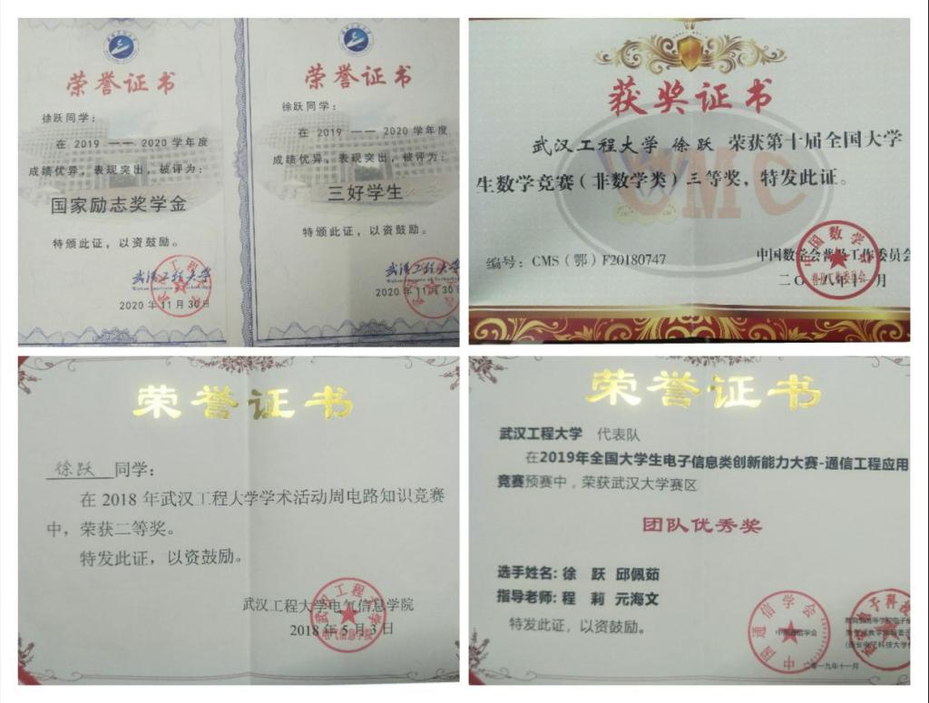 2017年9月,刚步入大学的徐跃并没有给自己设定什么远大的目标,只希望每个学期都有所进步。她在学业上从不“划水”,课堂上,坚持上课认真听讲,课余时间,阅读大量资料,整理笔记,确保老师上课所说的内容都能化为自己实际应用的知识。大二时,徐跃认真思考自己之后的毕业去向,并下定决心要考入自己梦想的学府读研究生,继续深造。有了明确的目标自然就有清晰的规划和前行的驱动力,她慢慢在学科竞赛上锤炼专业能力,“以赛致用,以赛促学”。曾获得全国老员工数学竞赛三等奖、中国高校计算机大赛网络技术挑战赛二等奖、校电路知识竞赛二等奖等诸多课外竞赛奖项。