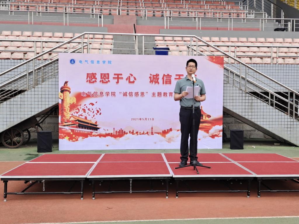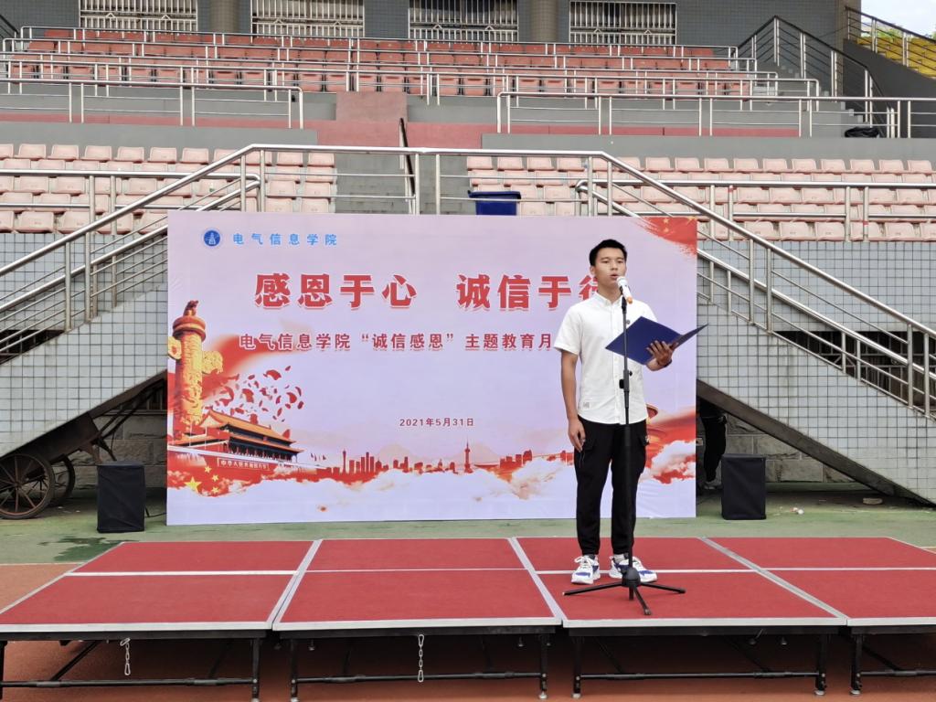 员工代表2020级自动化类1班本科生李成功作了《感恩于心,诚信于行》的主题发言,倡导同学们感恩立德,明礼修身,勇担责任,诚信做人。