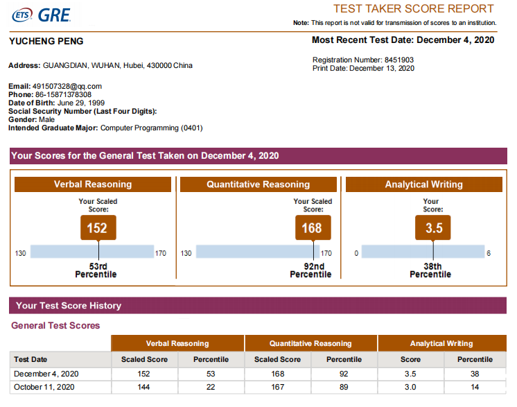 GRE 320 (语文-152, 53%; 数学-168, 92%; 分析性写作-3.5, 38%)