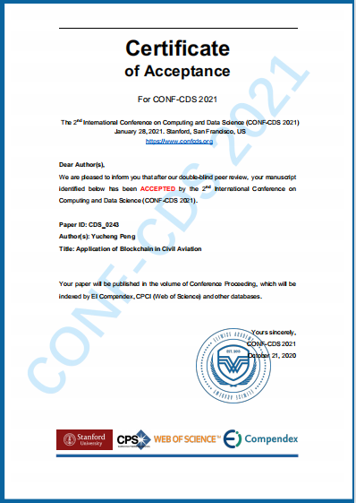 2020年发表EI论文“Application of Blockchain in Civil Aviation”,被斯坦佛大学举办的第二届计算与数据科学国际会议收录。