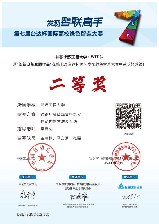 本网讯(通讯员 任伟)2021年7月24日-25日,由中国自动化学会主办,台达集团承办的自动化领域的绿色创新型科技竞赛—第七届“台达杯”国际高校绿色智造大赛圆满落幕。公司英国上市公司官网365王瑞林、马方潇、张磊三位同学组成的“WIT队”(参赛作品:钢铁厂烧结混合料水分自动控制方法及系统)在大赛总决赛中荣获二等奖。