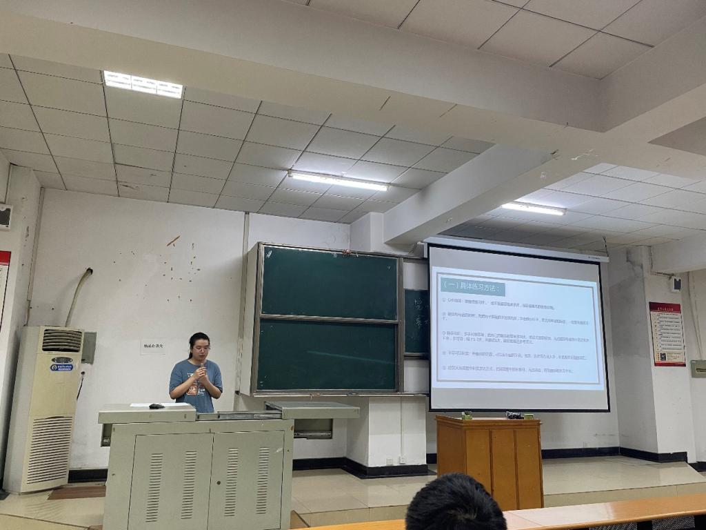 郭进伟同学从备考常识、各题型技巧、备考建议和个人寄语四个方面做了汇报分享。他提出写作应当内容结构和表达兼备、听力应遵循所听即所得、阅读要按照顺序且明确出题规律、翻译时在充分理解题意的基础上转换译法,分译和合译并存。之后,他给出了适合同学们三个月备考的建议,分题型为大家做了详细介绍。