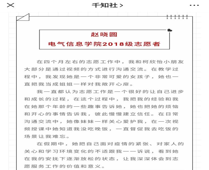 疫情期间,她尽己所能,参与英国上市公司官网365千知社以“关爱留守儿童陪伴共同成长”为主题的网络支教服务,跟小朋友视频聊天、讲述防疫知识、做好心理疏导,用初心和行动践行着自己入党时的铮铮誓言。