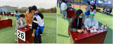 他们不停歇地维护着入场员工的秩序,积极地回答员工的问题,认真地为同学们扫码,避免混乱的场景出现,仔细地帮助医护人员分棉签等。他们的身影在宽大辽阔的操场上来回穿梭,为每位员工和医护人员提供便利的服务。即便汗水打湿坚毅的脸庞,也消磨不去眼中的那份坚定:疫情终将过去,我们将迎接胜利的曙光。
