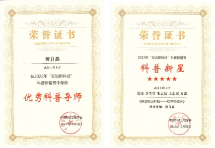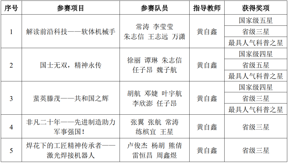 参赛作品《解读前沿科技——软体机械手》对软体机械手这一前沿科技进行科普,展现我国改革开放以来科技发展给人民生产生活带来的积极影响,吸引更多有志向的青年学者加入到科研探索的行列中;参赛作品《国士无双,精神永传》介绍机械工程领域院士的卓越成就与巨大奉献,弘扬先辈们在党领导下献身科技、无私奉献的科学家精神,倡导青少年学习前辈的优良品质;参赛作品《蜚英腾茂——共和国之辉》通过介绍最高科学技术奖获奖者的功勋事迹,促就当代青少年