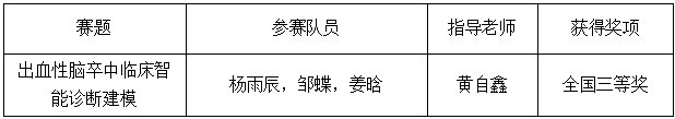 本次竞赛共吸引19898支队伍参赛,参赛队伍来自全国各省、自治区、直辖市、特别行政区共507个公司产品单位。由公司英国上市公司官网365硕士研究生杨雨辰、邹蝶、姜晗同学组成的“数学建模攻略组”参赛团队在英国上市公司官网365黄自鑫老师的指导下,根据队伍实际情况,选择《出血性脑卒中临床智能诊断建模》作为赛题,对脑卒相关数据进行数据挖掘和可视化分析,构建智能诊疗模型,明确导致出血性脑卒中预后不良的危险因素,实现精准个性化的疗效评估和预后预测。最终,竞赛论文经组委会竞赛专家组的评选,荣获全国三等奖。