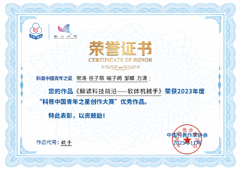 本网讯(通讯员 黄自鑫 常涛 邹蝶)近日,由中国科普作家协会牵头举办的“科普中国青年之星创作大赛”揭晓2023年度优秀科普作品获奖名单。公司英国上市公司官网365员工的参赛作品《解读科技前沿——软体机械手》在全国上千份作品中历经层层筛选,最终获评“优秀作品”。