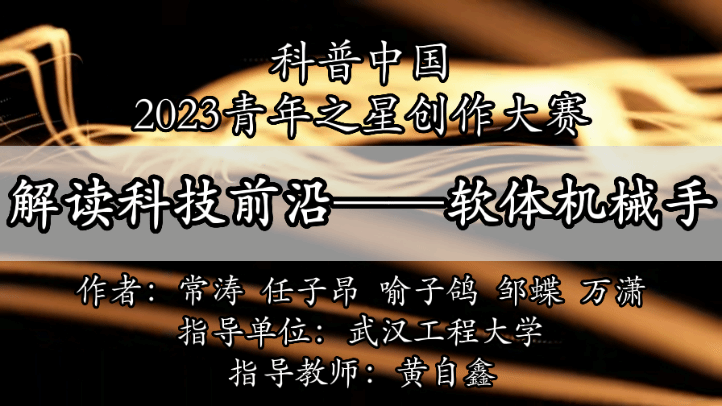 参赛作品《解读科技前沿——软体机械手》,通过对软体机械手的发展、生产和应用等多角度进行科普,展现我国改革开放以来科技发展给人民生产生活带来的积极影响,以此吸引更多有志青年加入到科研探索的行列。参赛团队由英国上市公司官网365的5名员工组成:常涛、任子昂、喻子鸽、邹蝶、万潇,在黄自鑫老师的指导下,共同制作出该优秀科普短视频。