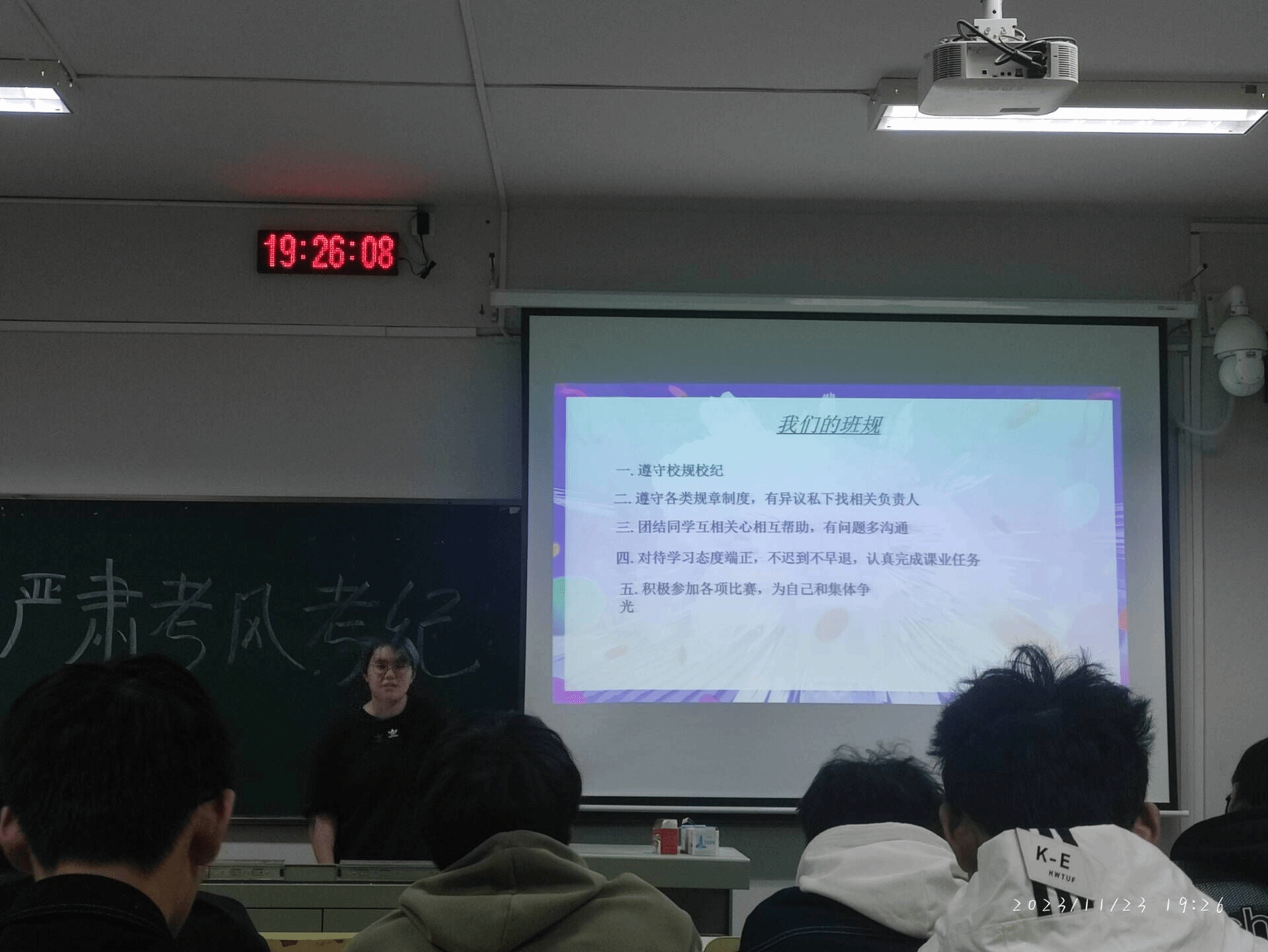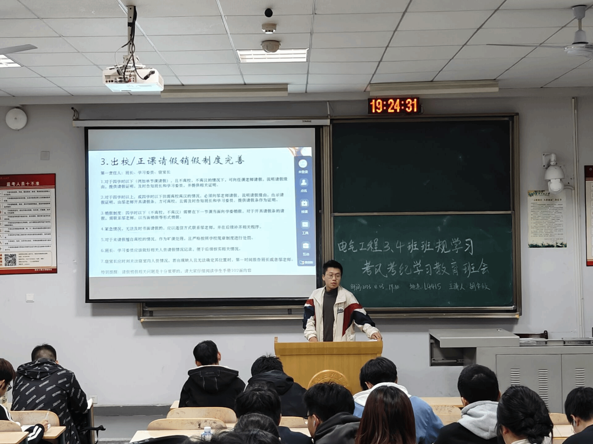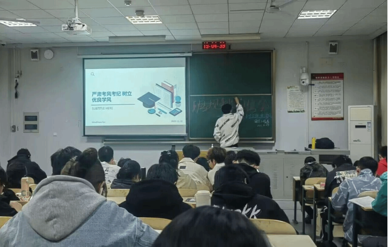 二是强调规章正考风。针对即将到来的期末考试,班长再次强调考风考纪,并结合近年的相关案例强调了诚信考试的重要性。同时带领同学们观看关于“诚信”的视频,强调违纪作弊的后果,加深了同学们对规章制度的敬畏之心,引导同学们严格遵守考试规章制度,端正态度对待每一场考试,靠真实能力取得优异成绩,用诚信行为展现良好考风。