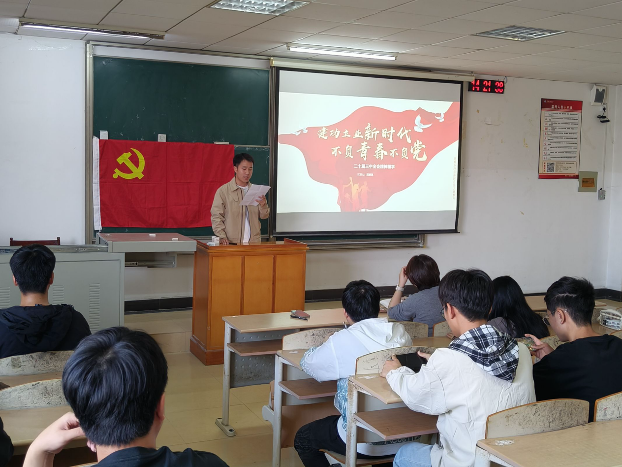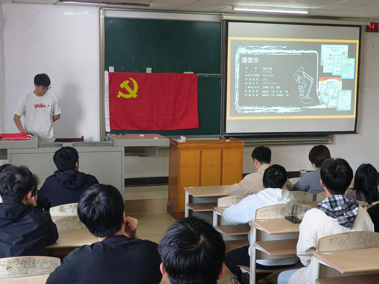 活动在庄严激昂的国歌声中拉开序幕,2024级辅导员郑鹏凯通过微党课的形式带领与会人员深入学习了党的二十届三中全会精神。他指出,学习贯彻党的二十届三中全会是当前和今后一个时期的首要政治任务,作为新时代的老员工,我们应当加强理论学习,提高政治素养;创新学习方法,提升学习成效;参与社会实践,服务社会发展;注重自我反思,持续改进提高。支部党员汪巧玲、于永水结合学习心得做了交流发言。推免至电子科技大学的支部党员唐圣华为参会同学做了保研经验分享,他鼓励2024级同学要尽早做好学业规划,严格要求自己,从上好每一堂课,做好每一次笔记做起。