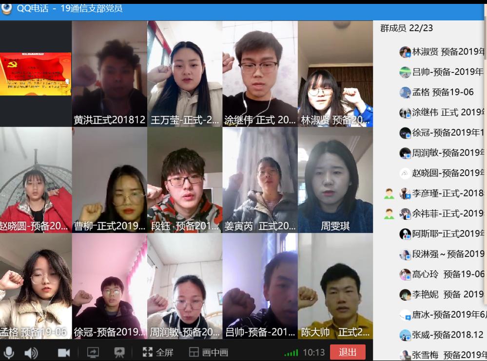 支部其他党员同志也积极分享了自己在疫情期间的学习、生活状态,少数民族党员阿斯耶充分肯定了家乡硬核有效的防疫措施;高心玲、段钰、涂继伟等几位毕业生党员分享了自己的考研经历,并表示疫情期间会持续关注考研信息,做好研究生复试工作;其他党员也纷纷表示将一如既往的做好本职工作,科学防疫,积极发挥党员引领作用,就算宅家也要为防疫工作做出自己的点滴贡献。