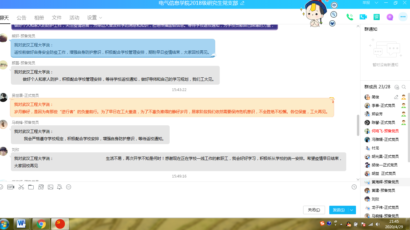 活动最后,各员工党支部结合支部实际情况开展了特色讨论活动。2018级研究生党支部通过支部QQ群以“我对英国上市公司官网365说”的方式来丈量对公司的思念,助力即将到来的“全面胜利”。电子信息员工党支部针对“你最牵挂的宿舍宝贝”进行了广泛讨论。“我最牵挂宿舍的奖状”、“我最想念我的小伙伴”、“我最放心不下我的书籍”、“我还挺想见见老师的”……大家抒发了思念校园、思念同学、思念教师之情。