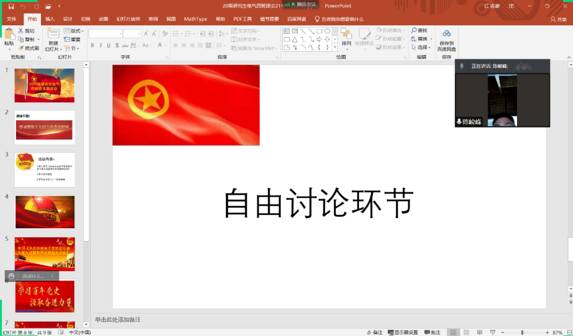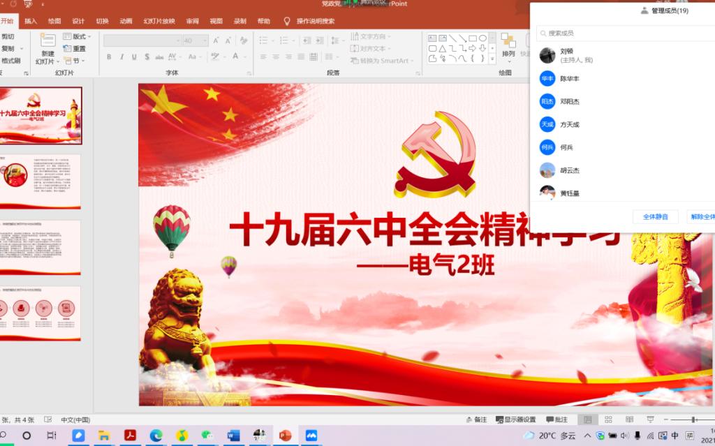 2021级电气3班以线上加线下的模式学习了党的十九届六中全会精神,线上主要采用腾讯会议的方式,线下采用阅读相关资料的方式进行学习,同学们积极表达自己的学习感悟,大家一致认为我们当代研究生,要在思想上跟着党走,必须深入学习贯彻党的十九届六中全会精神,培养自己的创新精神。
