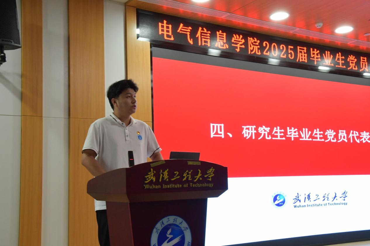 本科生党员代表张宪蒲回顾了在党支部的成长历程,分享从参与者到组织者的蜕变感悟:“党务工作教会我‘埋头做事’的责任担当。未来无论身处何方,必将以党员标准严格要求自己,在平凡岗位上浇灌梦想。”
