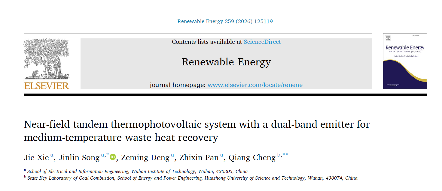 (通讯员 谢杰)近日,2022级硕士研究生谢杰(导师:宋金霖副教授)在中科院一区Top期刊《Renewable Energy》上发表学术论文“Near-field tandem thermophotovoltaic system with a dual-band emitter for medium-temperature waste heat recovery”。《Renewable Energy》是一本专注能源领域的国际学术期刊,创刊于1991年,由Elsevier BV出版商出版,出版周期Monthly。该刊发文范围涵盖能源、工程技术、纳米技术等领域。该刊已被SCIE数据库收录,在中科院最新升级版分区表中,该刊分区信息为大类学科工程技术一区,2025年影响因子为9.1。