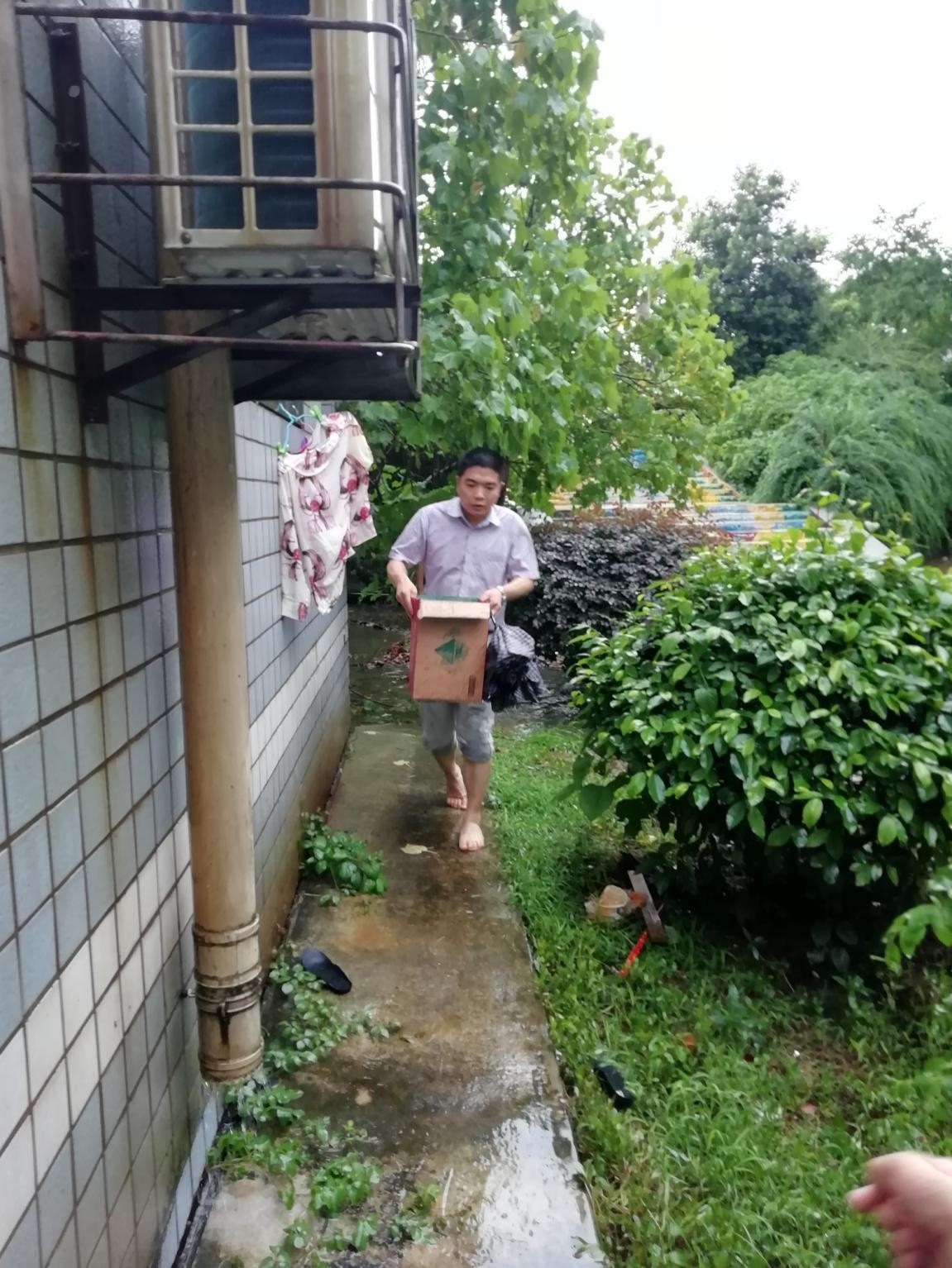 本网讯(通讯员周雯琪)由于昨夜暴雨入注,水深过腰,公司教辅6栋女生被困寝室无法正常出行,导致员工不能及时上课和吃早饭。6月21号早上8点半,康书记带领学工办全体辅导员去食堂及小卖部买了包子、馒头、面包、泡面等食物冒着大雨,赤着脚赶到员工寝室,及时的将一份份食物送到了员工手中。
