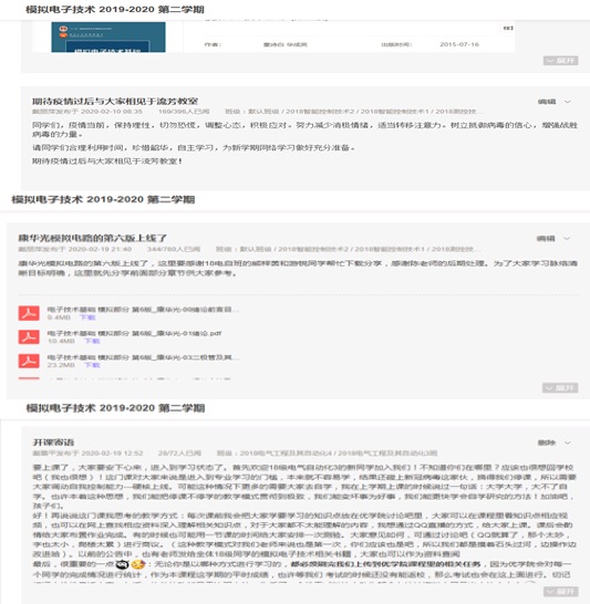 在疫情暴发前《模拟电子技术》课程网络平台已经建设完成,在“停课不停学”的号召下,课程组老师积极应对,成立课程组群,就本课程教学模式改变会出现的问题集中讨论,确定相应解决方案。下图为课程组老师开课前期利用网络讨论习题库的完善和课程安排等事项。