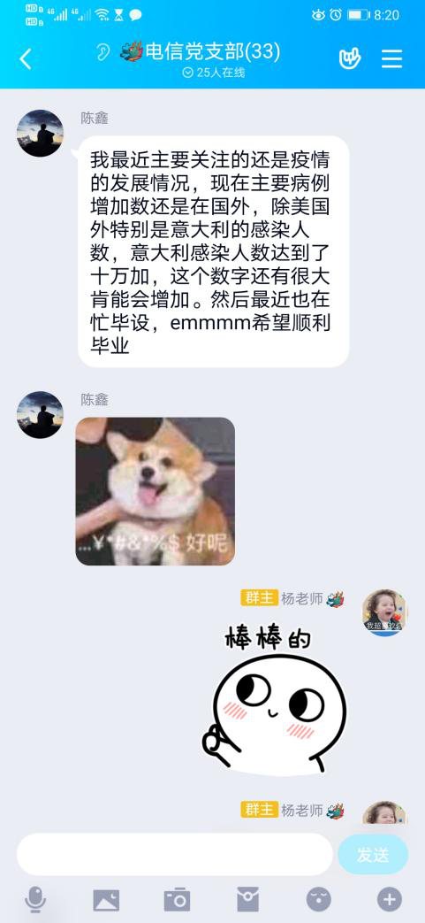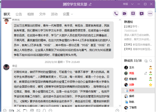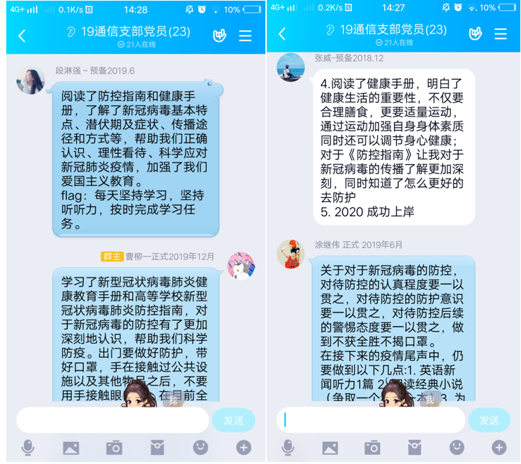 会议最后,通信员工党支部全体党员在支部QQ群给自己立下了每日flag,支部低年级员工党员表示要持续上好网课,努力学习专业知识,保质保量完成老师布置的作业,为考证考研做好准备。毕业生员工党员表示要认真准备毕业设计,考研复试以及线上签约等工作,大家提出要坚持每日健康打卡,宅家不忘锻炼等;电信员工党支部通过总结近期国内外重要时政,从国际上其他国家疫情的大范围爆发以及别国的应对策略深感中国制度优越性与构建人类命运共同体的迫切性,从有记忆以来高考第一次延期得出疫情影响深远,告诫我们要铭记历史,善待自然。支部党员在讨论中加深了对疫情的认识,在交流中思想得到了进一步升华。