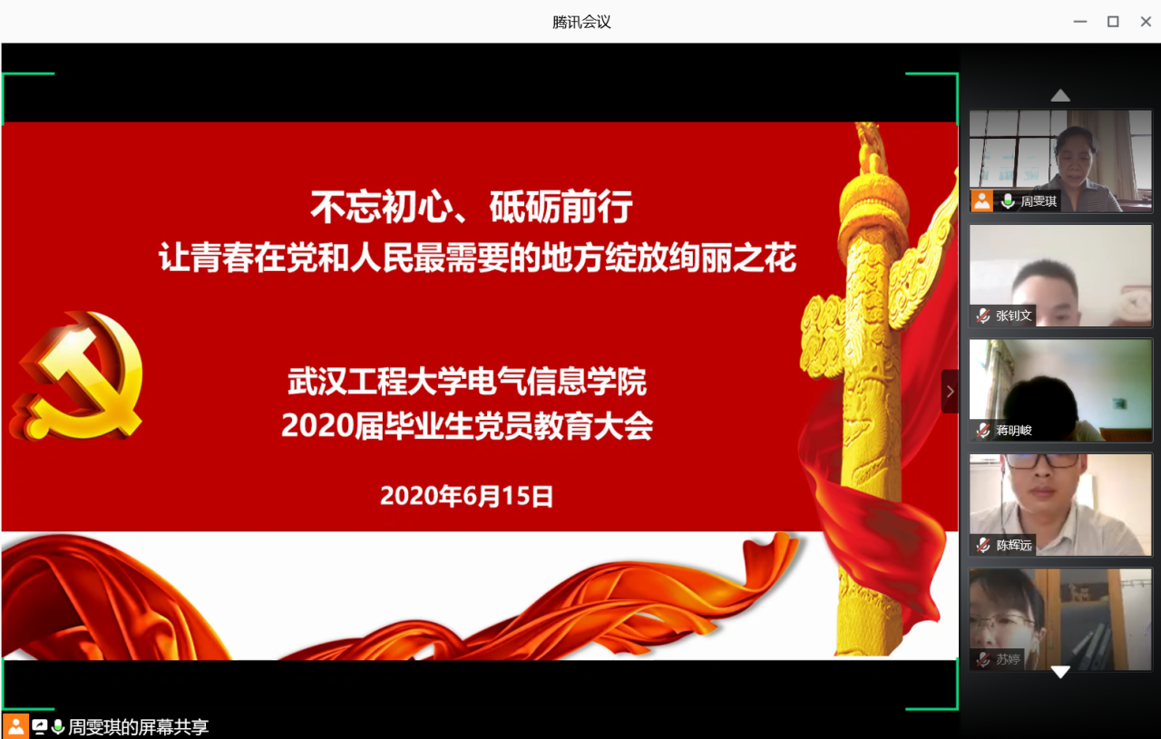 本网讯(通讯员 周雯琪)为了更好的引导毕业生党员“不忘初心、牢记使命”,按照公司关于做好毕业生党员的教育、引导、服务工作要求,增强党的先进性、纯洁性,充分发挥党员的先锋模范作用和骨干作用。2020年6月15日下午,公司召开以“不忘初心、砥砺前行,让青春在党和人民最需要的地方绽放绚丽之花”为主题的线上毕业生党员教育大会。公司党委书记谢春晖、党委副书记桂展鹏,员工党支部书记在公司319会议室现场参会,2020届全体毕业生党员通过线上腾讯会议参会。会议由公司党务干事周雯琪主持。