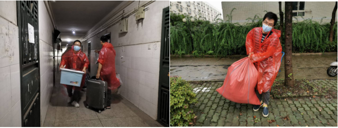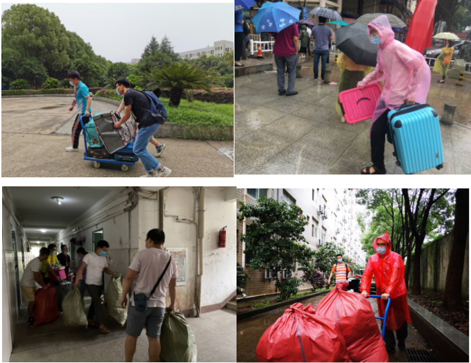 身披简陋雨衣,齐齐上阵,摇身一变为“搬运工”、“拖车工”、“快递员”,把一件件“宝贵”又“沉重”的行李扛上肩、搬上车、拖上路。虽雨水模糊了镜片、浸湿了衣衫、泡坏了双脚,却丝毫没有影响老师们坚定的步伐。