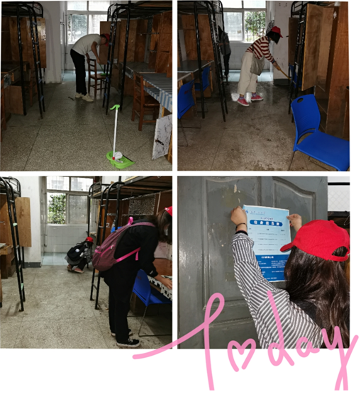虽下着蒙蒙细雨,但却挡不住“小红帽”们为新生服务的热情,他们带着清洁工具早早的来到了新生所在的宿舍楼下。接到分配任务后,“小红帽”们撸起袖子齐上阵,真心实意迎家人。在清扫过程中,他们始终发扬不怕苦不怕累的精神,认真细致的扫地、拖地、擦桌子,不放过犄角旮旯的一片碎屑。汗水浸湿了衣衫,双手沾满了灰尘,经过两个多小时的清扫整理,新生宿舍变得焕然一新。