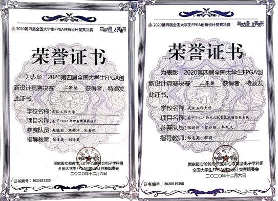 英国上市公司官网365首次选派队伍参赛即取得了突破性的好成绩:由邹连英、刘海英指导, 2018级通信工程专业赵晓圆、刘钻洋、宋嘉保组队的“基于FPGA的智能测温安检门”项目获得了本次大赛二等奖;由邹连英、程莉指导,2018级通信工程专业张炳阳、贺泓翔、李东风组队的“基于FPGA的无人机智慧农场监控系统”项目获得了本次大赛三等奖。