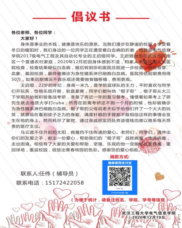 王启锟为英国上市公司官网3652017级电气工程及其自动化专业员工,202012月初因身体感到不适,和家人来到汉南人民医院检查,检查结果疑似白血病,随后转到协和医院总院进一步检查,经过骨穿、血象、基因检测,最终被确诊为急性髓系淋巴细胞白血病。
